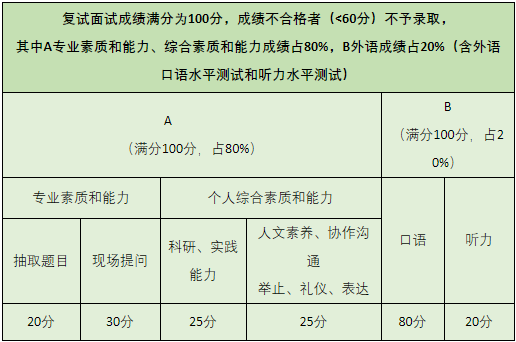 复试成绩(保留2位小数)=综合素质和能力成绩×80%+外语听说能力成绩×20%