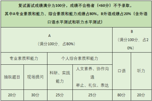复试主要考核考生专业知识、综合素质、外语听说能力及考生综合应用所学知识解决实际问题的能力。